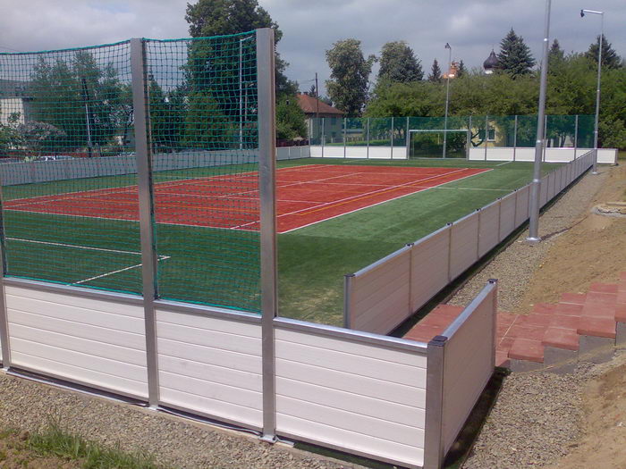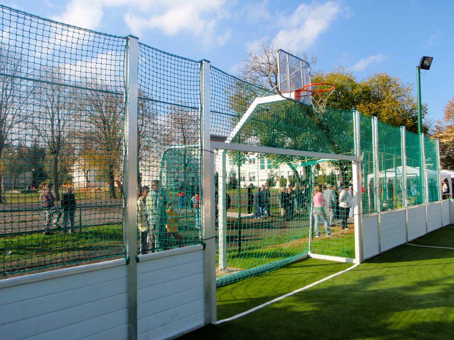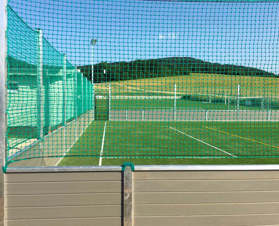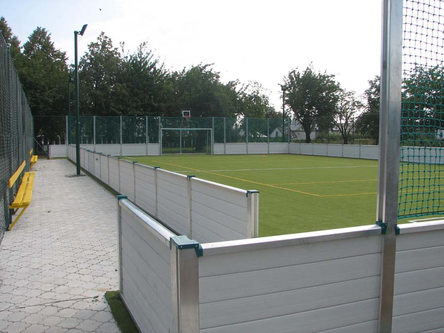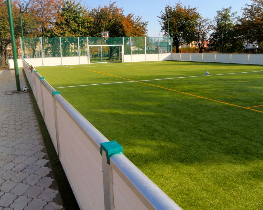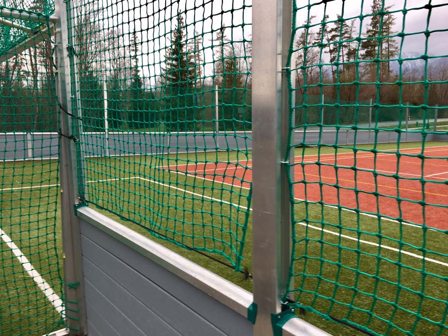 This kickboard system is made for permanent installations. It consists of aluminum posts with plastic panels that fit seamless into the aluminum profiles. The panels are UV stable, for all weather conditions, super durable and color stable. Safety nets are 3m high – on the short side or all around the field.